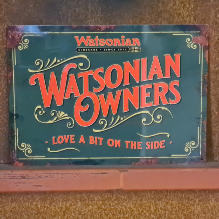 Vintage style Watsonian Owners ‘Tin’ Sign. Painted in a distressed style, with a hole in each corner for easy mounting.
