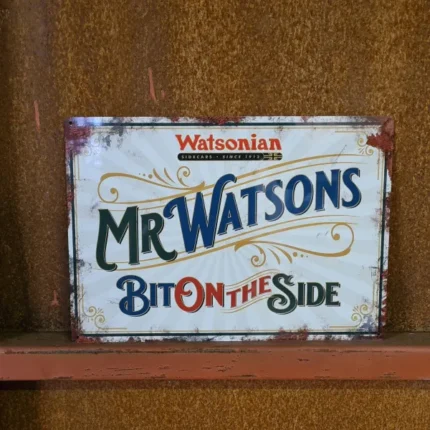 Vintage style Mr Watson’s Bit on the Side Sign ‘Tin’ Sign. Painted in a distressed style, with a hole in